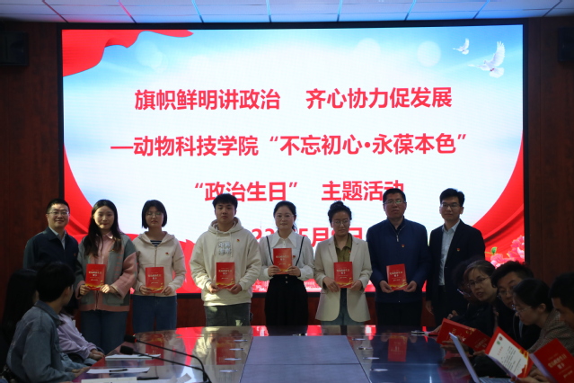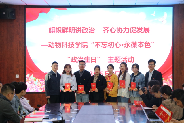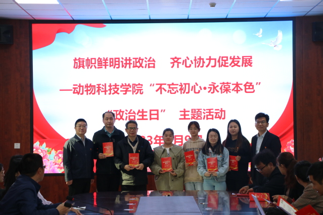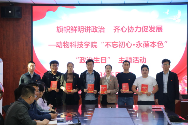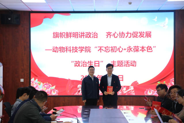 动物科技学党委书记胡昌娃同志、经理张辉同志一同为全体党员赠送“政治生日贺卡”。