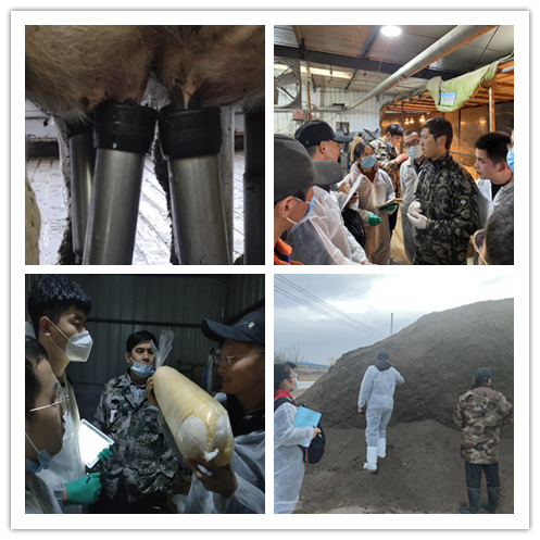 奶牛场第三站—奶厅。奶厅是牛场中重要的一个环节,奶产品也是牛场重要的经济来源。来到奶厅,工作人员正在进行挤奶工作,工作人员对奶牛挤奶现场情况和挤奶操作程序进行了讲解,刘贤侠老师对前药浴、后药浴等药物的具体作用和挤奶注意事项给同学们做了进一步的补充。