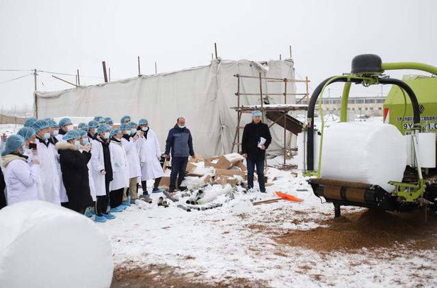 在教学活动中,王新峰老师带领同学们观摩了裹包微贮饲料的制作流程,并现场对棉花秸秆生产加工的原理和过程、裹包微贮饲料的优势进行了讲解。并示意同学们亲自感受棉花秸秆青贮的质地和气味。然后在保持安全距离的前提下,还带领同学们观看了裹包的过程,并进入养牛圈舍,观察牛采食棉花秸秆微贮饲料的效果和圈舍内建筑的布局和结构。