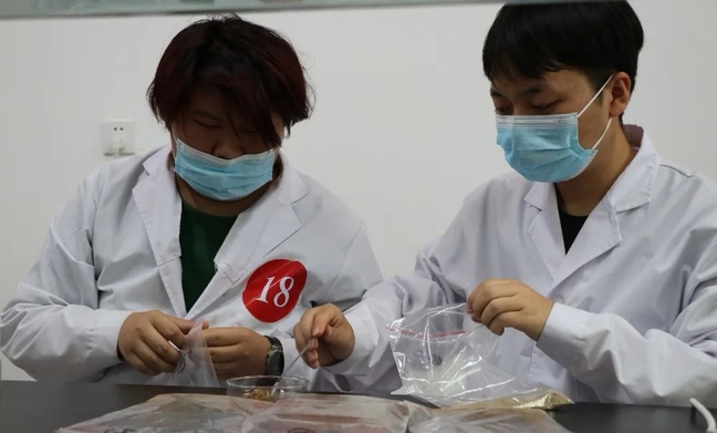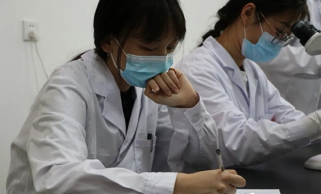 比赛开始!每个小组分工明确,有人仔细地操作着显微镜,观察显微镜下掺假原料的特征;有人用药勺取料,将其均匀地摊布在培养皿上,同时又肉眼观察每组饲料的不同之处;有人填写着实验报告,将对应样品中掺假原料的名字、显微镜检的观察结果以及化学分析的反应过程等工整简洁的写在报告上。