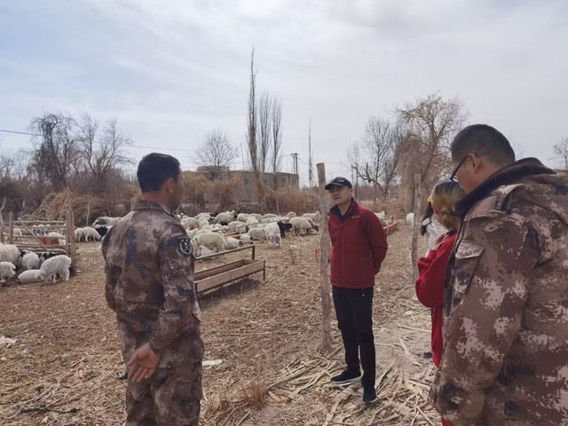 在224团8连昆泰美养殖合作社,负责人介绍了多胎羊养殖过程中羔羊存活率低、饲草料短缺等问题。团队针对圈舍环境、羔羊保育、母羊营养管理等提出改进意见。在与8连共建的墨玉县雅瓦乡阿克切坎勒村养殖示范户托合提麦麦提·麦麦提依明的羊圈,团队查看了肉羊养殖用草用料、疫苗使用、日常管理、羔羊养护等情况,提出科学养殖培训和农作物秸秆饲料化利用技术示范方案。