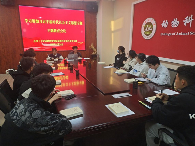 4月24日,动物科学本科生党支部在动科院主楼A223会议室举行“学习贯彻习近平新时代中国特色社会主义思想”专题教育活动。会议由动物科学专业本科生党支部副书记曹正宇主持,动物科学本科生党支部书记胡月老师及动物科学全体党员参加会议。